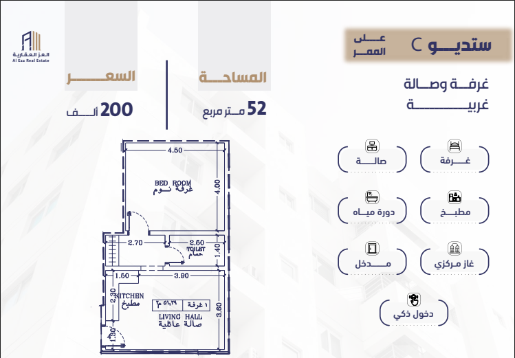 غرفة – صالة – مطبخ – دورة مياه – مدخل واحد – غاز مركزي – دخول ذكي